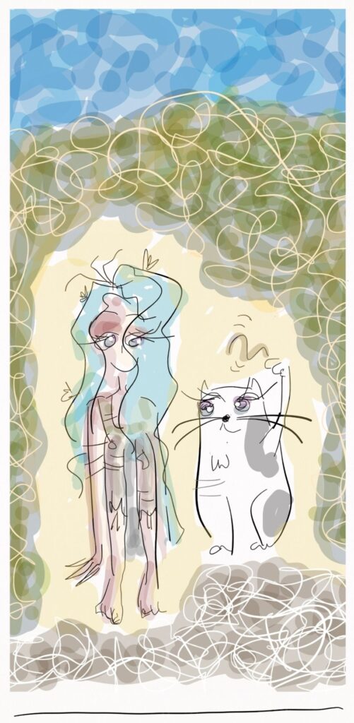 Sin embargo, aquel día, en lugar de bajar una de las dueñas más o menos reconocibles, se dejó caer por los escalones un ser aterrador. Era una forma cubierta con guedejas azules, con trozos de cosas enredadas. Se rascaba lo que debía ser el pescuezo con fruición. Bostezó y se le contorsionó la cara en una mueca horrenda. Apenas vislumbraron al personaje, Jules y Fifí se escondieron bajo la viga que servía de estante zapatero, junto a la puerta. No se atrevían ni a respirar para que ninguna pequeña parte de su cuerpo sobresaliese del madero. Se miraban con los ojos muy abiertos: ¿Qué era aquello? (1).